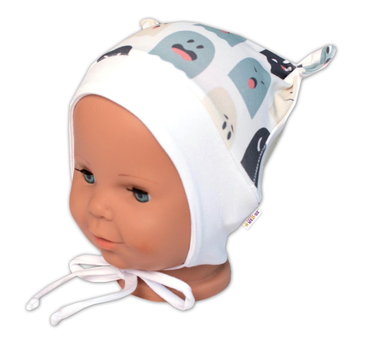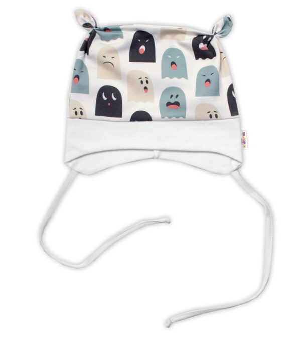 Baby Nellys Kojenecká čepička uzlíček na zavazování – Příšerky, bílá/mátová , vel. 68/74