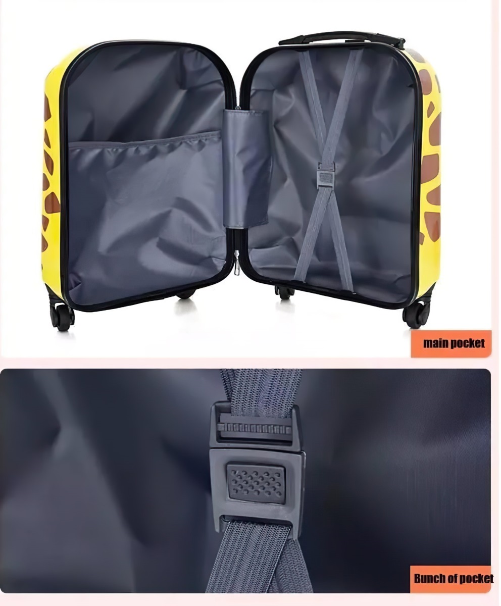 Nádherný dětský cestovní kufr na kolečkách pro nejmenší cestovatele. Perfektní pro všechny typy výletů, prázdninové výlety, školní nebo předškolní výlety. Ideální do letadla – jako příruční zavazadlo. Kufr je vyroben z ABS plastu, polykarbonátu odolného proti poškození, má ochrannou fólii, která jej chrání před poškozením. Součástí kufru je výsuvná teleskopická rukojeť, čtyři kolečka odolná proti zatížení, uzavíratelný standartními zipy. Vnitřek kufru je podšitý podšívkou s bezpečnostními popruhy.  Materiál ABS plast  Rozměry výška 45 cm šířka 30 cm hloubka 22 cm hmotnost 1,5 kg výška s vysunutým madlem max. 79 cm