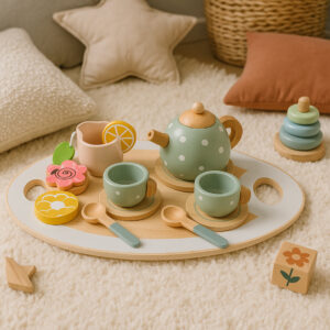 Realistické provedení, dřevěný materiál a promyšlená skladba dílů dělají ze sady krásný dárek pro předškoláky. Podporuje tvůrčí hru, učí základům stolování a přirozeně vede k přátelskému sdílení u „čajového dýchánku“. Skvěle zapadne do dětského pokojíčku i herního koutku.