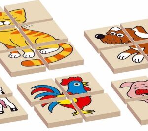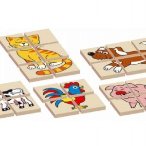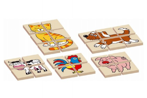 Oboustanná dřevěná skládanka s motivem zvířátek. 12 dílků, 5 zvířátek. V krabičce 17x12x1,5 cm.